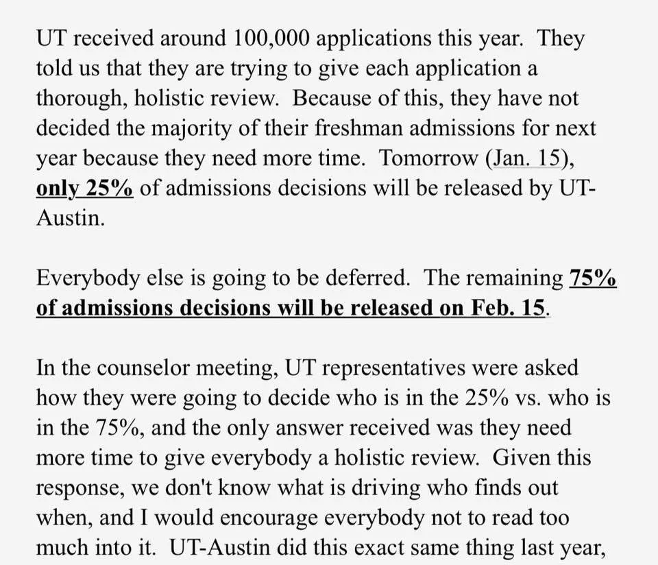 Something like three-quarters of my eventually-admitted Fall 2025 clients heard back in February, and not on January 15, including my very top-performing students. Many applicants who were invited to apply to the Forty Acres Scholars Program (FASP) were also deferred.